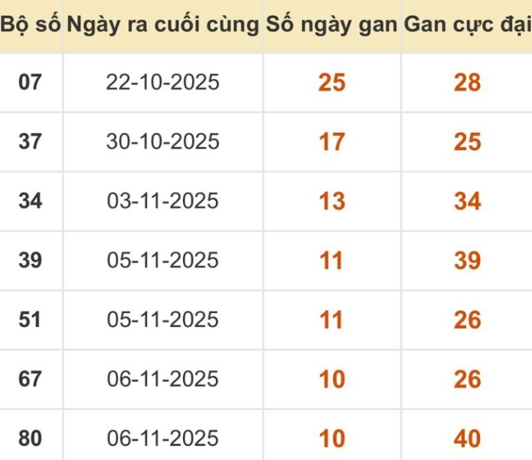 Thống kê lô gan XSMB 17/11/2025 sẽ mang lại cho bạn một số gợi ý mới để đặt cược trong kỳ này nhé: