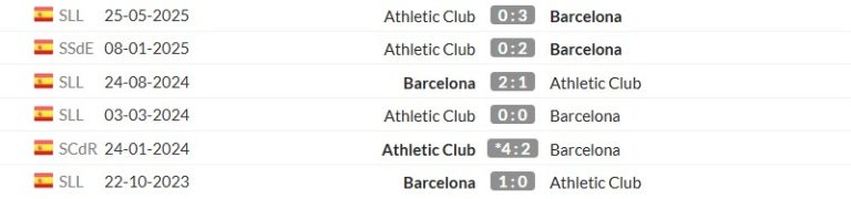 Lịch sử đối đầu giữa Barcelona vs Athletic Bilbao đang nghiêng về phía Barca. Trong 6 lần chạm trán gần nhất, Barca giành được 4 chiến thắng, hòa 1 và thua 1 trận. Athletic Bilbao thi thoảng gây bất ngờ tại San Mamés, nhưng khi hành quân đến Catalonia, họ hiếm khi giữ được thế trận trước lối đá kiểm soát mạnh mẽ của Barca.
