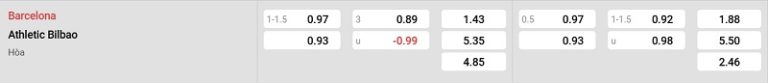 Bảng tỷ lệ kèo Barcelona vs Athletic Bilbao: