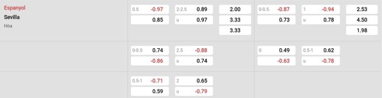 Bảng tỷ lệ kèo Espanyol vs Sevilla:
