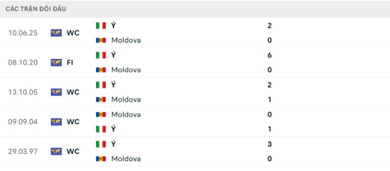 Thống kê lịch sử đối đầu giữa Moldova vs Italia